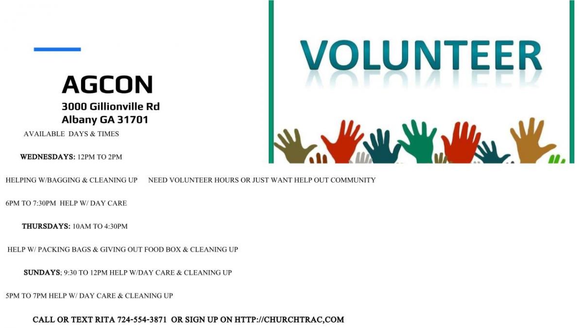 We as ACGON have great opportunity to get volunteer time for school, for community serves, or just wanting help community. My name Rita these hours and time we need most help if something in you range of time please call me or text me for more information my number 7245543871